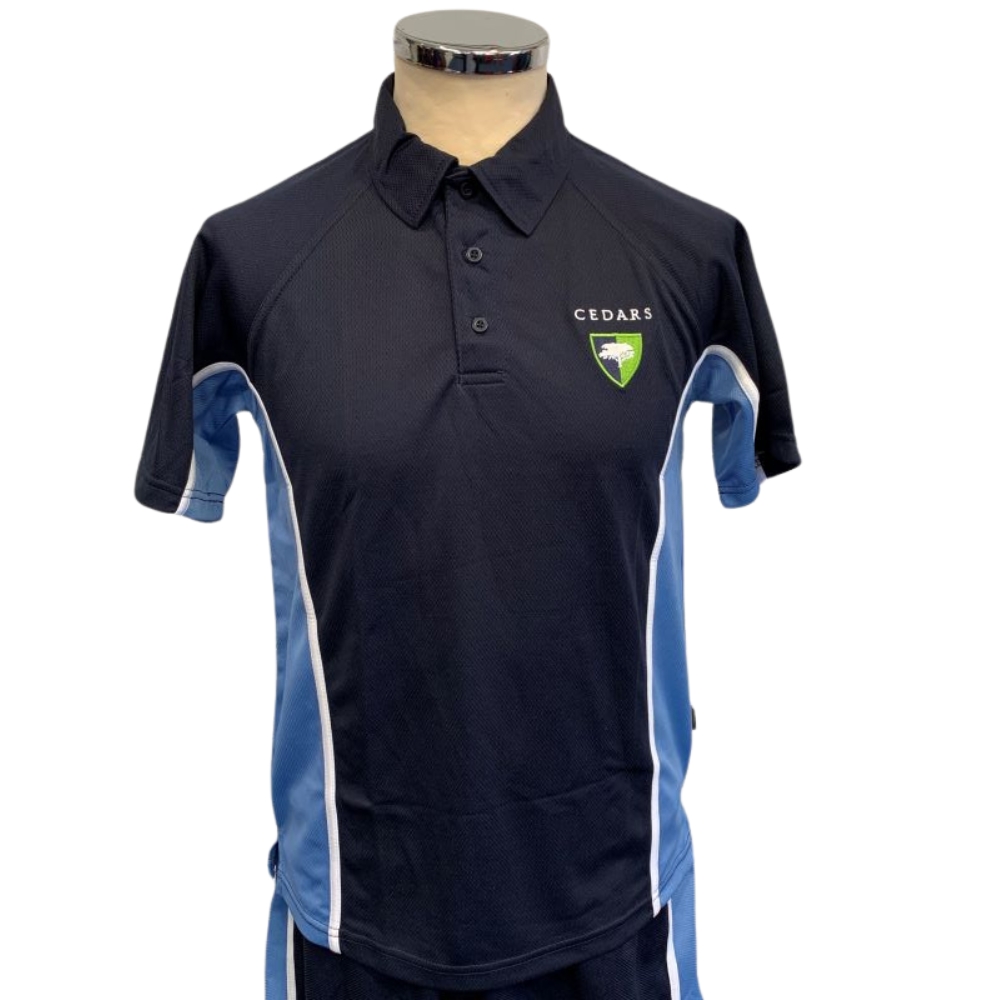 Navy and sky panelled sports polo shirt with the Cedars logo embroidered on the left breast. Compulsory for both boys and girls.