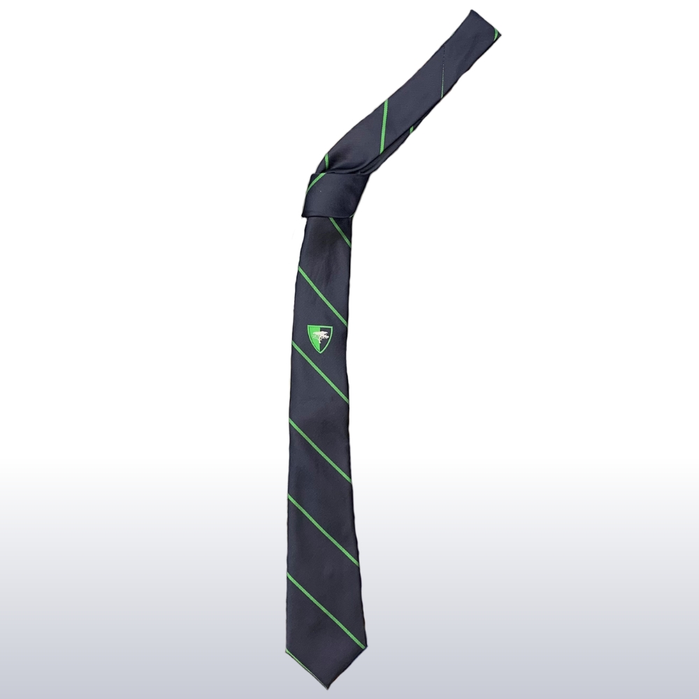 Navy Cedars Upper School tie with green stripe and embroidered with school logo. Compulsory for both boys and girls and to be worn with the ECO Jacket.