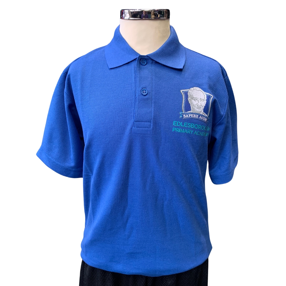 Royal blue polo shirt with Edlesborough Primary Academy logo printed on left breast.