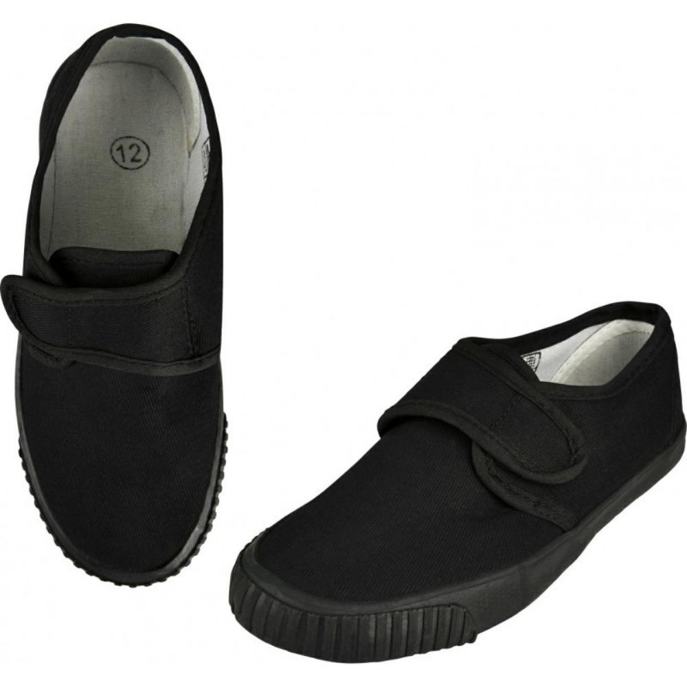 Black canvas plimsoll with a velcro fastening.